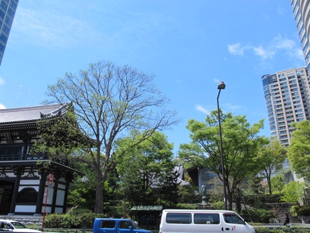 今日は三ヶ月に一度の病院の日でした。 サクラの花が散った後の新緑、好きです。 新橋の辺りですが、お寺の回りにキレイな緑がありました。
